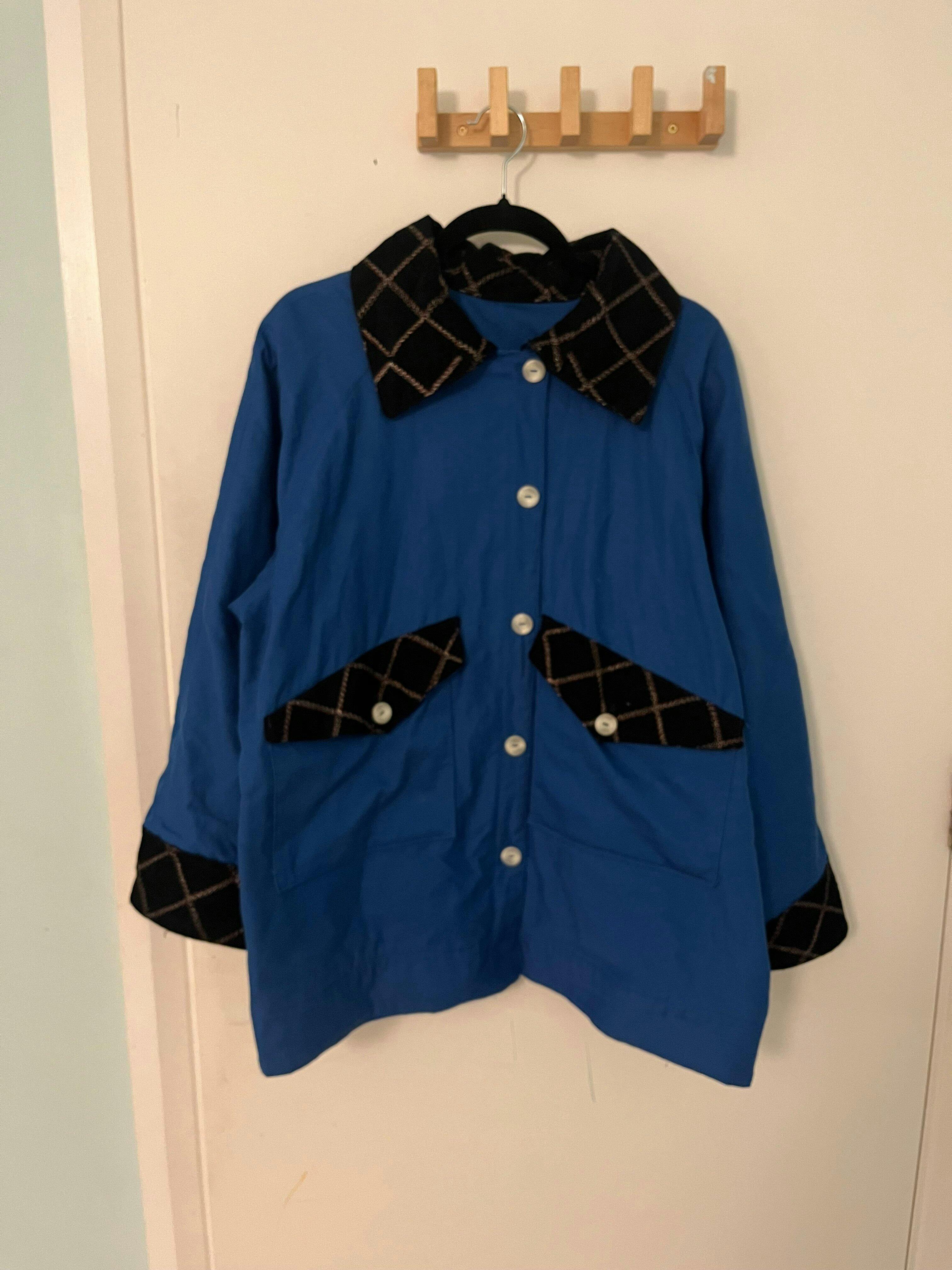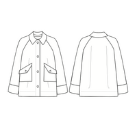Buy the La Barn Jacket sewing pattern from Atelier Brunette. This lined jacket features a relaxed, straight cut and raglan sleeves. Details include a contrast collar and cuffs, zipper hidden beneath a button placket, two large patch pockets with buttoned flaps, and an inside pocket.
