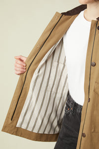 Suggested fabrics: Canvas or gabardine, in heavier or lighter weights depending on the season. Use a cotton or cotton blend for the lining. Sew the collar and cuffs in corduroy.