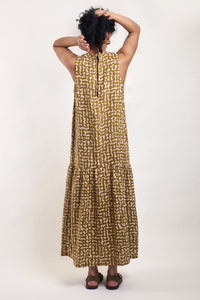 Buy the La Robe Flare sewing pattern from Atelier Brunette. La Robe Flare is a sleeveless maxi dress with gathers at the neckline and a dropped gathered skirt tier. It has a single button closure at the back.