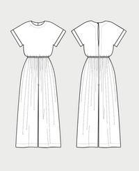 Buy the La Robe Pantalon sewing pattern from Atelier Brunette. This jumpsuit combines a tee and culottes into one playful and elegant piece. The loose top features a round neckline, wide grown-on sleeves, and a back slit with a button. It has an elastic waist for comfort, side seam pockets, and a 7/8 length.