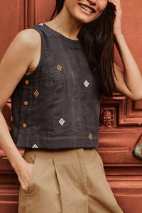 Buy the Le Top sewing pattern from Atelier Brunette. This sleeveless trapeze top has four playful side styles – from buttons to laces – making it a real treat to wear. Le Top has a round neckline and is hip length, with French seams and topstitching for a polished finish. An invisible zipper opens to the middle back.