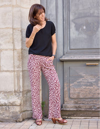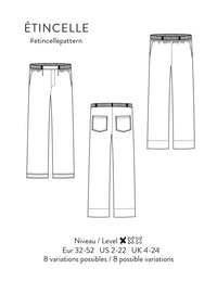 Buy the Etincelle Trousers sewing pattern from Atelier Scämmit. These pleated trousers have a fully or partially elasticated waistband. The straight leg can be finished with a simple hem or a topstitched cuff. Additional features include an optional mock fly, slant pockets at the front, and patch pockets at the back. Etincelle can be worn low-waisted or mid-rise.