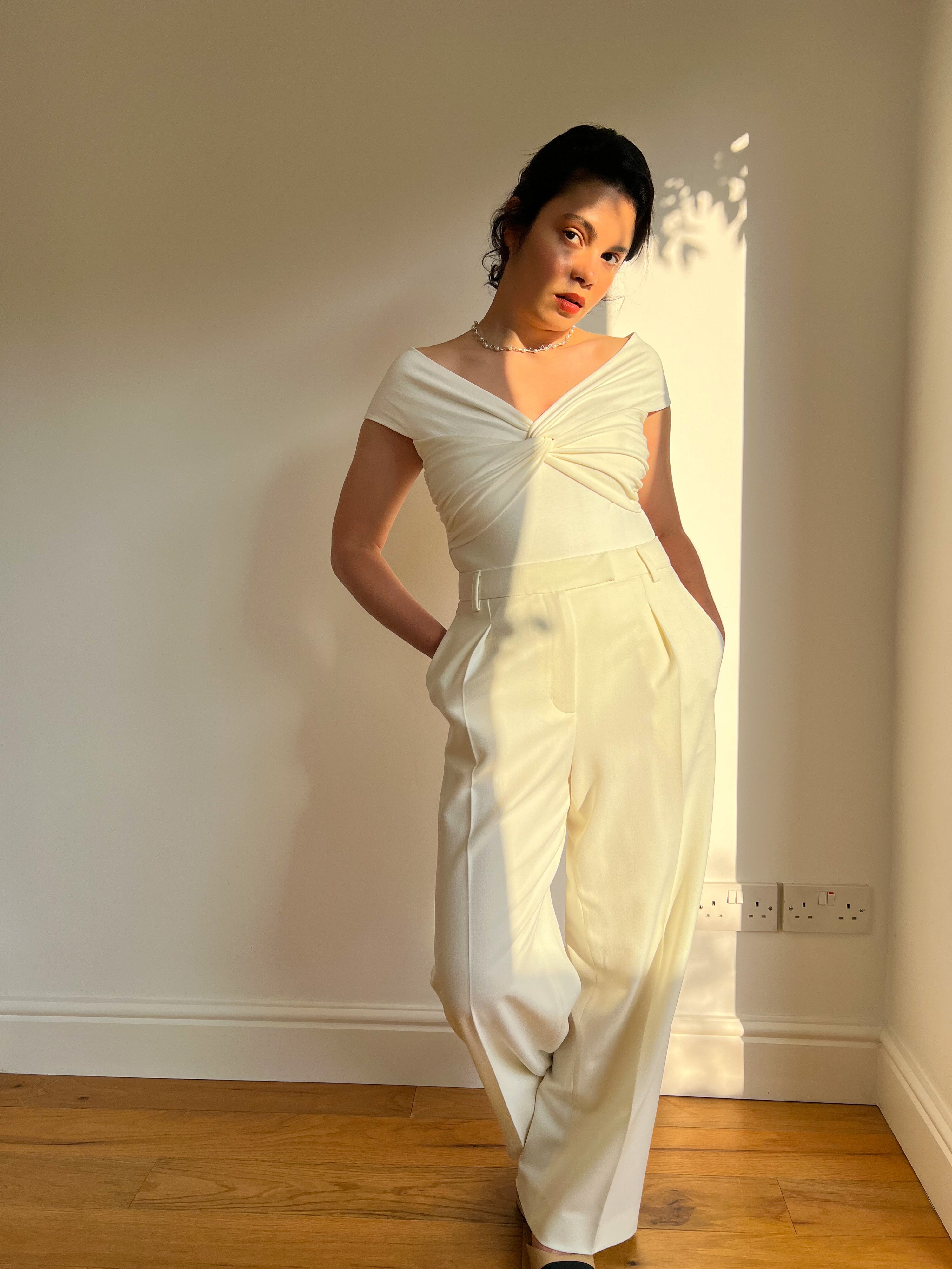 Buy the Neta Trousers sewing pattern from Bella Loves Patterns. Neta is a relaxed pair of high-rise, wide-leg trousers with pressed front and back crease lines. The trousers feature a fly front, stitched-in-place pleats at the front, waist darts at the back, and side slant pockets. The waistband extends past the centre front and fastens with a hook and bar and internal button. The trousers are floor length with an invisible hem.