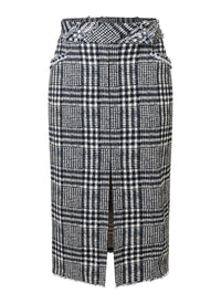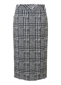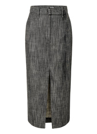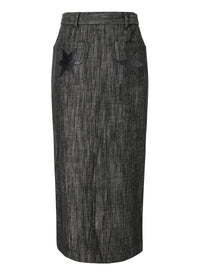 Buy the 5715 Misses' Skirts sewing pattern from Burda. This skirt pattern, perfect for experienced sewers, offers two stylish versions. The first combines a rock jeans vibe with elegant details: star-adorned pockets, an extra-long belt with eyelets, and a figure-hugging cut with a slit. The second merges denim and kilt styles, featuring a slim midi skirt with a slit and fringes that beautifully flatter the figure.