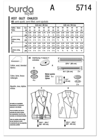 Buy the Misses' Vests 5714 sewing pattern from Burda. This vest pattern, ideal for advanced hobby sewers, offers two versatile variations. The first features a biker-inspired design with an asymmetrical closure, zipper pockets, and a belt—perfect for a rock look that’s also office-ready. The second combines sporty elegance with impeccable shaping and fine coat details like welt pockets and diagonal woollen fabric—truly eye-catching!