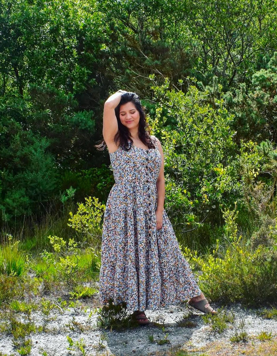 Buy the Shay Dress sewing pattern from Chalk and Notch. Shay is a maxi dress with a wide scoop neck and fitted bodice. The skirt has three gathered tiers. There are elbow length puff sleeves or a tank option for both views. View A has a centre back invisible zipper. View B has centre front buttons.