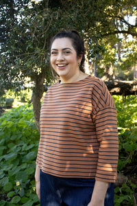 Buy the James Tee sewing pattern from Christine Haynes. The James Tee is a classic Breton-style knit top with a boxy fit. The gently curved neckline is wide enough to read as a boatneck, but not so wide that your bra straps will show. The neckline is finished simply with a fold to the inside and topstitched in place. The drop shoulders allow for a grown-on cap style sleeve, or you can choose to sew the sleeves pieces on for a bracelet length sleeve. The straight side seams end with a split hem, with the back 1" longer than the front. The split side seam is finished with cotton twill tape for a clean, ready-to-wear inspired look.