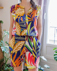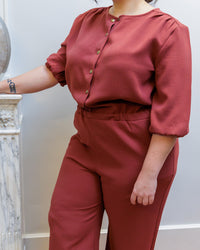 Buy the Astrid Blouse, Dress and Jumpsuit sewing pattern from Coralie Bijasson. With this versatile pattern you can create a blouse, dress or jumpsuit, all with or without sleeves. Astrid has a round neckline, delicate gathers at the shoulders, and buttons at the front. The jumpsuit version has straight legs, which can be shortened to make a romper. Astrid is perfect for any occasion, from a day at the beach to an elegant evening out.