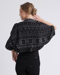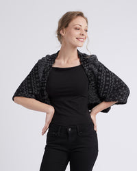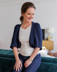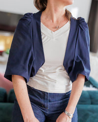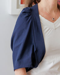 Buy the Naomie Shrug sewing pattern from Coralie Bijasson. Naomie is a simple cropped cardigan, designed to be worn over a strappy dress or camisole to add a relaxed yet cosy layer. The short sleeves are gently gathered at the shoulders for soft volume.