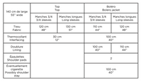 Top: 140 cm (55") wide fabric: 3/4 sleeves, 120 cm (48") // Long sleeves, 130 cm (51").
