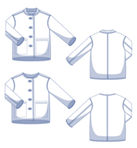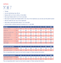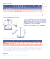 Notions: Iron-on interfacing, max. 85 cm; buttons, 2-2.5 cm diameter, 4 for XS-L or 5 for XL-XXXL; bias tape, folded width 2-2.5 cm (see chart) // Optional: bias tape for pocket welt, folded width 2 cm, max. 25 cm (you can use pattern piece instead); rib knit, 35 cm wide, max. 30 cm.