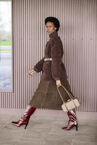 Buy the Greta Jacket sewing pattern from Fibre Mood. Greta is for those who love special details and a bit of a challenge. The seams are sewn with the wrong sides facing and finished with bias binding for a striking effect. Greta also features bound buttonholes, welt pockets, and an optional rib knit collar. Add your favourite belt to tie the look together beautifully.