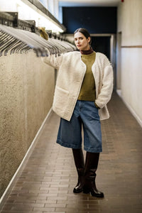 Suggested fabrics: Choose teddy or faux shearling fabric to give this jacket its cosy appeal. Bouclé or soft felt are also excellent choices. Avoid fabrics that are too thin or drapey – this jacket looks best in fabrics with body. For the pockets, facings, etc., use a contrast fabric without texture such as canvas or twill.