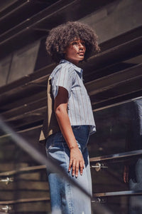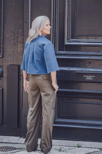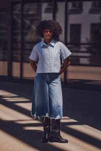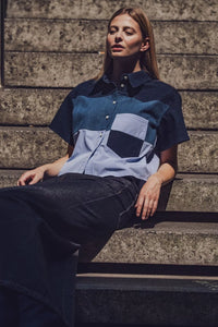 Melody is a boxy, cropped shirt with a chest pocket and short, straight sleeves. The neat topstitching adds that little bit of extra detail and guarantees a cool denim look. Pair Melody with a high-waisted skirt or trousers.