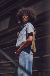 Mimi is the upcycled version of Melody. The front and chest pocket are divided into two parts, perfect for using up fabric scraps. The pleats at the back give an extra boxy silhouette. Mix and match to your heart's content. Unique, sustainable and effortlessly on-trend.