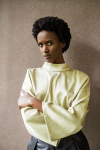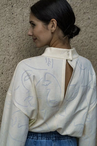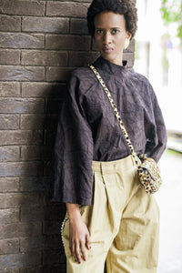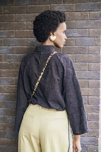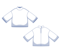 Buy the Samira Top sewing pattern from Fibre Mood. Samira epitomises elegant simplicity. This flowy top has a stand-up collar with a button fastening at the back, and wide sleeves that create an airy, graceful look.