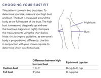 Choosing your bust fit: Measure your high bust and bust. The bust is measured around the body at the fullest part of the bust. The high bust is measured diagonally up and over the bust. Compare the measurements, and use this in conjunction with your known cup size to determine with bust fit to make. If the difference between your high bust and bust is 1" - 3" (B cup - C cup) use the medium bust. If the difference between your high bust and bust is 3" plus (D cup plus), use the full bust.