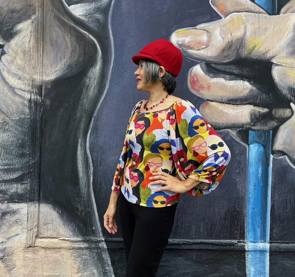 Buy the Adrienne Blouse sewing pattern from Friday Pattern Company. The Adrienne Blouse is a fashion forward wardrobe essential. It is a knit top with billowy statement sleeves that are gathered up at the shoulders and hems with elastic. The length is slightly cropped with the hem hitting just below your bellybutton.