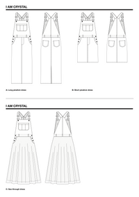 Buy the Crystal Dungaree Dress sewing pattern from I AM Patterns. I am Crystal, a dungaree dress that revisits a classic to give it a modern twist. I keep the signature details that make this piece iconic: a loose fit, front and back bibs, adjustable straps, a large compartmentalised chest pocket, two front slash pockets, buttoned side openings, and contrast topstitching. I change appearance according to which of three skirts you choose. The long straight skirt and short straight skirt both have a faux fly and two back patch pockets. The long flared skirt has a layer of tulle.