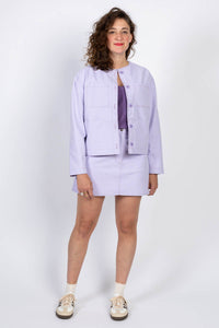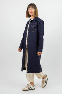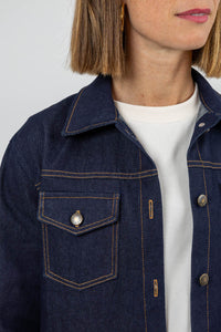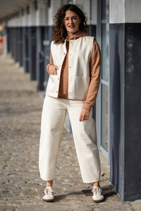 Buy the Gold Jacket sewing pattern from I AM Patterns. I am Gold, a reimagined denim jacket or vest with 18 variations. I feature all the classic elements of a denim jacket: a straight cut, slightly dropped shoulders, shirt collar, front and back panelling, two flap chest pockets and two welt pockets, button closure, adjustable waist tabs, sleeves with cuffs, and contrast topstitching. Without changing my cut, I can also transform into a workwear jacket: my pockets become straight patch pockets, my hem is finished with a simple edge, and my sleeves are simpler and finished with a hem. I come in three lengths – short (high hip), classic (hip), and long (below the knee) – and can be sewn without my collar or sleeves for complete styling freedom.