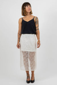 My first style is a long or short denim skirt with a fitted waistband, zip fly, front pockets, back pockets, and contrast topstitching. The long version has a back vent. My second style combines a long sheer outer skirt with a short opaque inner skirt. My third style is a long or short simple skirt with an invisible zip at the back.