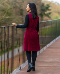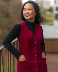 Buy the Elmstead Pinafore sewing pattern from Itch to Stitch. The Elmstead Pinafore is a versatile wardrobe staple designed to be worn over a shirt, turtleneck or tee. Its classic silhouette works beautifully in a variety of fabrics: corduroy for a traditional look, denim for casual wear, or wool for a slightly dressier style. It has front and back princess seams, cup size options, and an optional waist strap at the back for adjustable shaping. The front features a V-neckline, button closure, and slanted pockets at the hips. The neckline and armholes are finished with bias binding.
