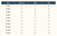 Sizing: EU 34 – 52 (approx. UK 6 – 22, based on our standardised size chart). Please also check the designer's size chart and finished garment measurements.