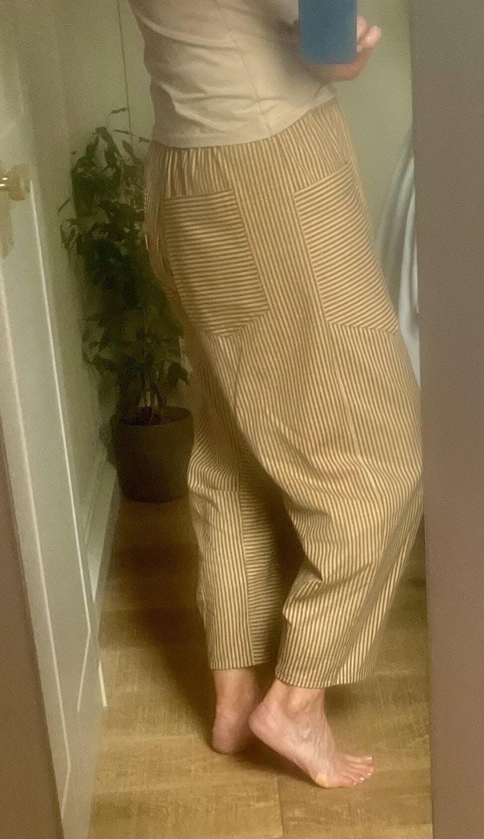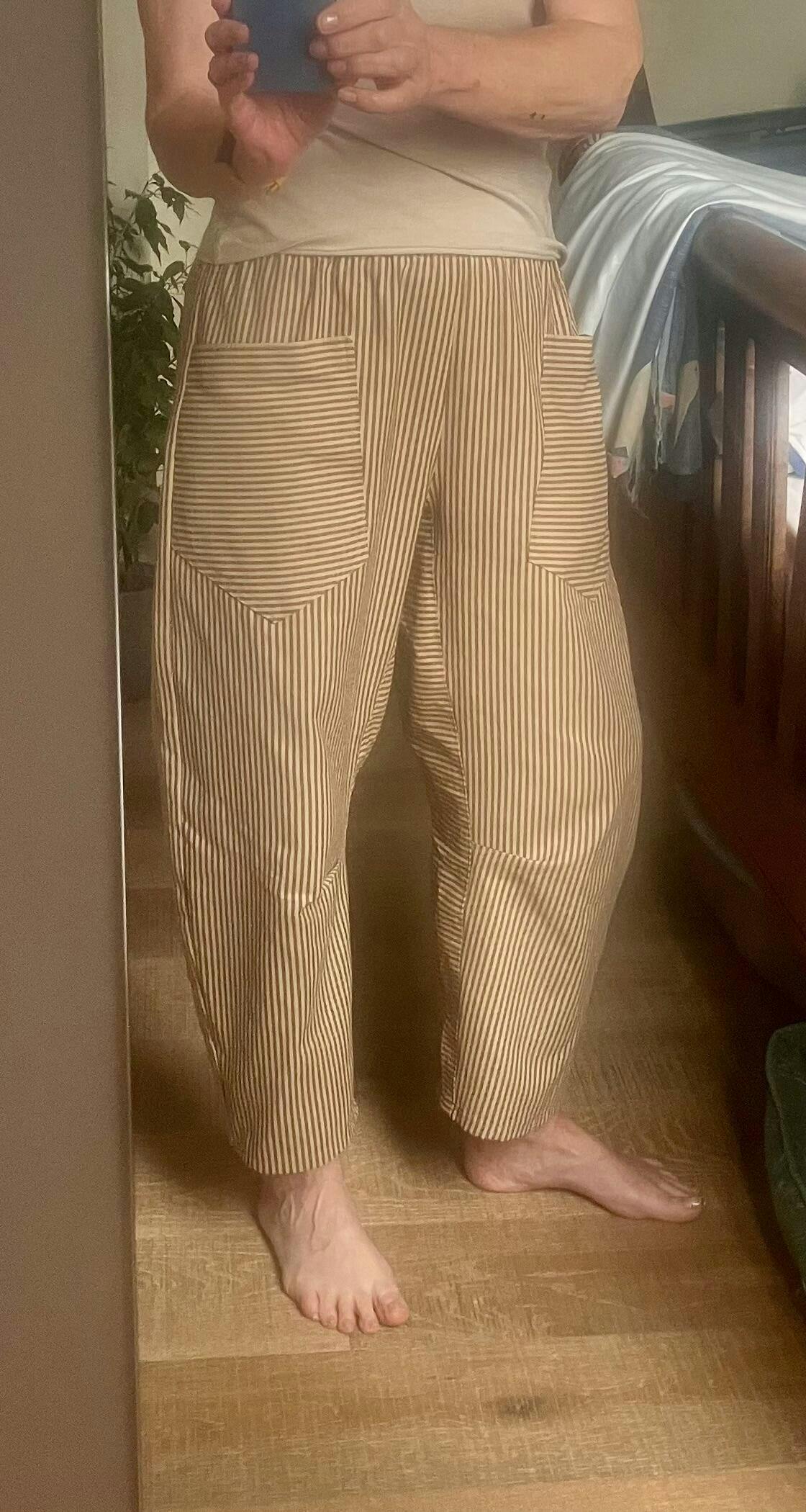 Buy the Archer Work Pants sewing pattern from Matchy Matchy Sewing Club. These easy-fitting barrel-shaped pants feature special details like oversized askew front pockets and a contrasting inseam panel. There are knee darts on both the front and back legs as well as a back ankle dart, giving these pants their distinctive shape. These elastic waist pants are intended to sit at the natural waist with a relaxed fit in the hip and looser fit through the legs. The length hits above the ankle to further highlight the shape.