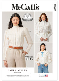 Buy the M8620 Misses' Blouses by Laura Ashley sewing pattern from McCall's. Vintage McCall's 1980's Laura Ashley blouses sewing pattern. Buttoned blouse View A has front and back yokes, buttoned stand-up collar and front bands, sleeves with gathered cap gathered to wide buttoned cuffs. Collar, yokes and cuffs have ruffles and lace trim. Blouse View B has tucked front and stand-up collar, buttoned back opening, sleeves with gathered cap and buttoned hemline opening. Buttoned Blouse View C is gathered to front and back yokes and has upper collar, wide under collar and purchased ribbon bow; tapered raglan sleeves have buttoned cuffs. Sizes 16-24 only available as a PDF.