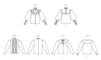 Suggested fabrics: Batiste, Cotton, Cotton Blends, Crepe de Chine, Handkerchief Linen. Views B,C also in Chambray, Oxford Cloth. Not suitable for diagonals, stripes or plaids. Interfacing: Lightweight Fusible or non-fusible.