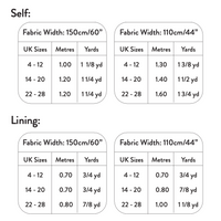 Self: 150 cm (60") wide fabric: 1 - 1.2 m (1 1/8 - 1 1/4 yd) // 110 cm (44") wide fabric: 1.3 - 1.6 m (1 3/8 - 1 3/4 yd).