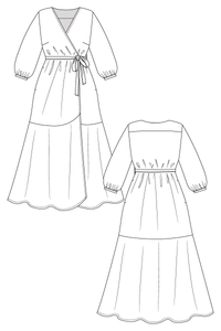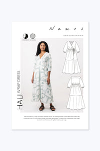 Buy the Hali Wrap Dress sewing pattern from Named. The Hali Wrap Dress is a comfy and stylish wardrobe staple. It features a semi-fitted wrap bodice with a V-neck and back yoke, a tie closure, and handy side pockets. The dress has a voluminous, ankle-length circle skirt and 3/4-sleeves with gathered sleeve openings.