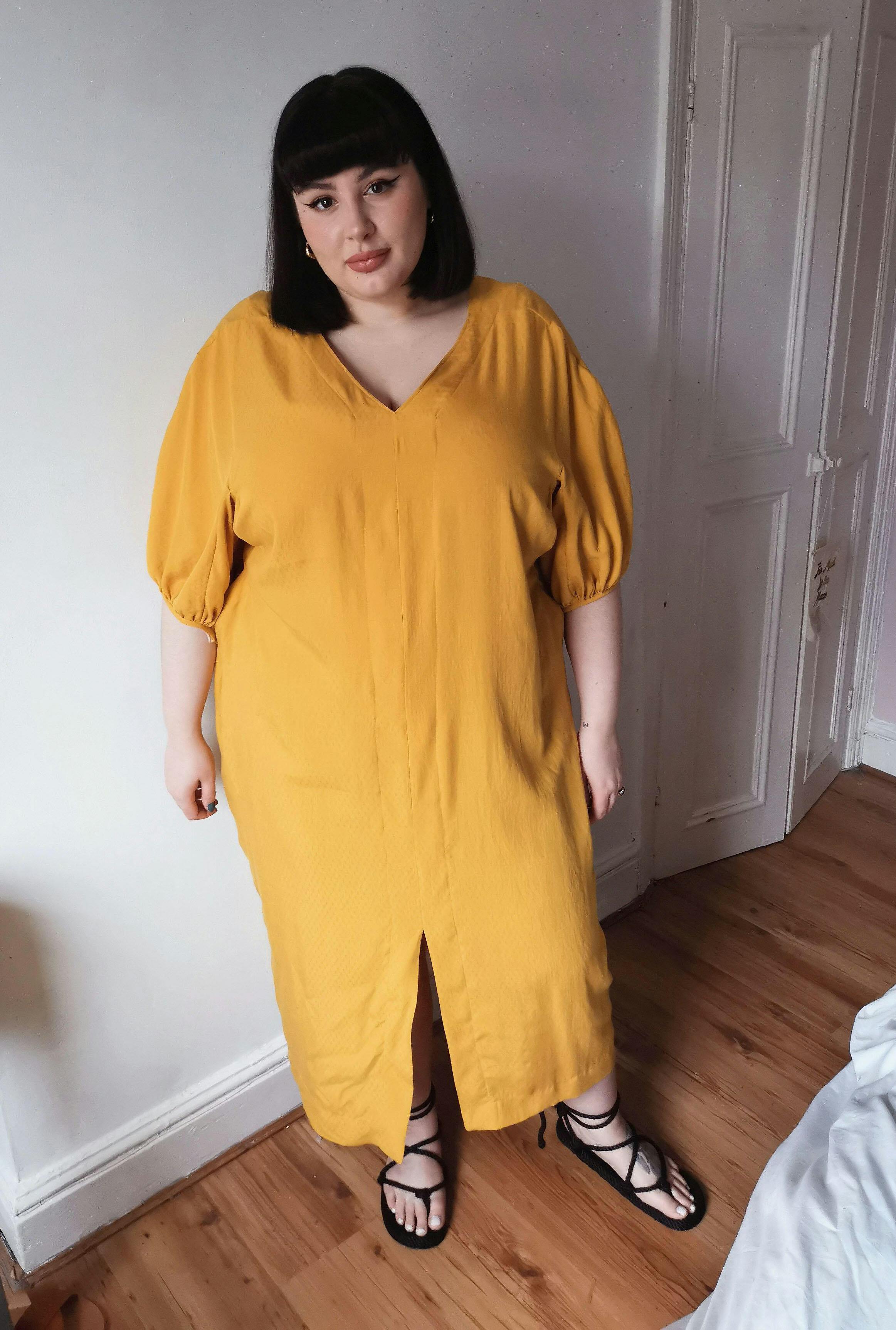 Mersis features Dynasty style balloon sleeves, a deep ‘V’ neck at the back and a midway ‘V’ neck at the front. The ‘V’ necklines are purposefully cut to be above most bra straps and to minimise shoulder drop. The centre front seam features a wide seam allowance topstitched down to enhance the long line from shoulder to hem. The centre front hem has a split and mitred corners for the longer lengths.