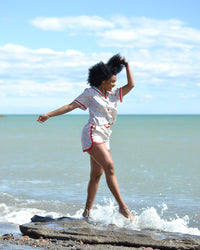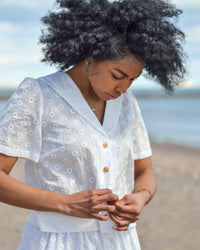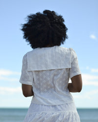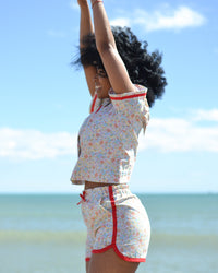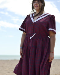 Buy the Nautic Set sewing pattern from Pauline Alice. This is a set of three patterns to make a blouse, shorts and skirt. The button front blouse features a sailor collar and short sleeves with decorative bias binding. The shorts have an elasticated paper bag waist, slanted pockets, and bias binding. The skirt features an elasticated paper bag waist and gathered panel.