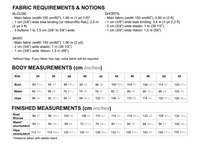 150 cm wide fabric: Blouse, 1.8 m // Shorts, 0.9 m // Skirt, 1.9 m.