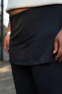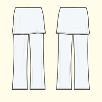Buy the Skirty Pants sewing pattern from Puff and Pencil. The Skirty Pants feature an elastic waistband designed to also accommodate an optional skirt attachment, creating the appearance of a skirt worn over the pants. The pants are fitted at the waist and gently flare out at the ankles.