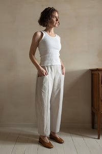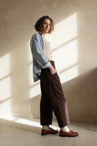 With its 7/8 length, straight or barrel leg, and mid rise (size range 1) or high rise (size range 2) waist, Emile has a clean, structured silhouette. The vertical seam running along the leg defines the design, while the pockets inserted between this seam and the side seam add both function and a distinctive graphic touch.
