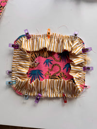 Buy the Layer Cake Bag sewing pattern from Sew Bake Make. This cute boxy bag features ruffles along the edges and a zipper closure. The seams are finished with bias tape. It comes in two sizes and is great as a makeup or toiletry bag, or you can add D-rings and a strap to make it into a purse!