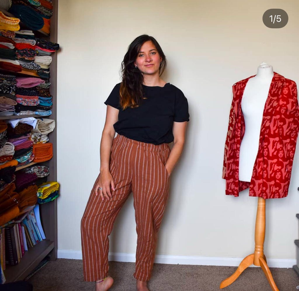 There are two options - a tapered leg version and a straight, cropped version. Both have an elastic high waist, side panels, front pockets that are top stitched in place from behind, and an optional back patch pocket(s). The tapered legs look great rolled up so the finished garment measurements show rolled and unrolled measurements and the instructions include options for French and flat-fell leg seams.