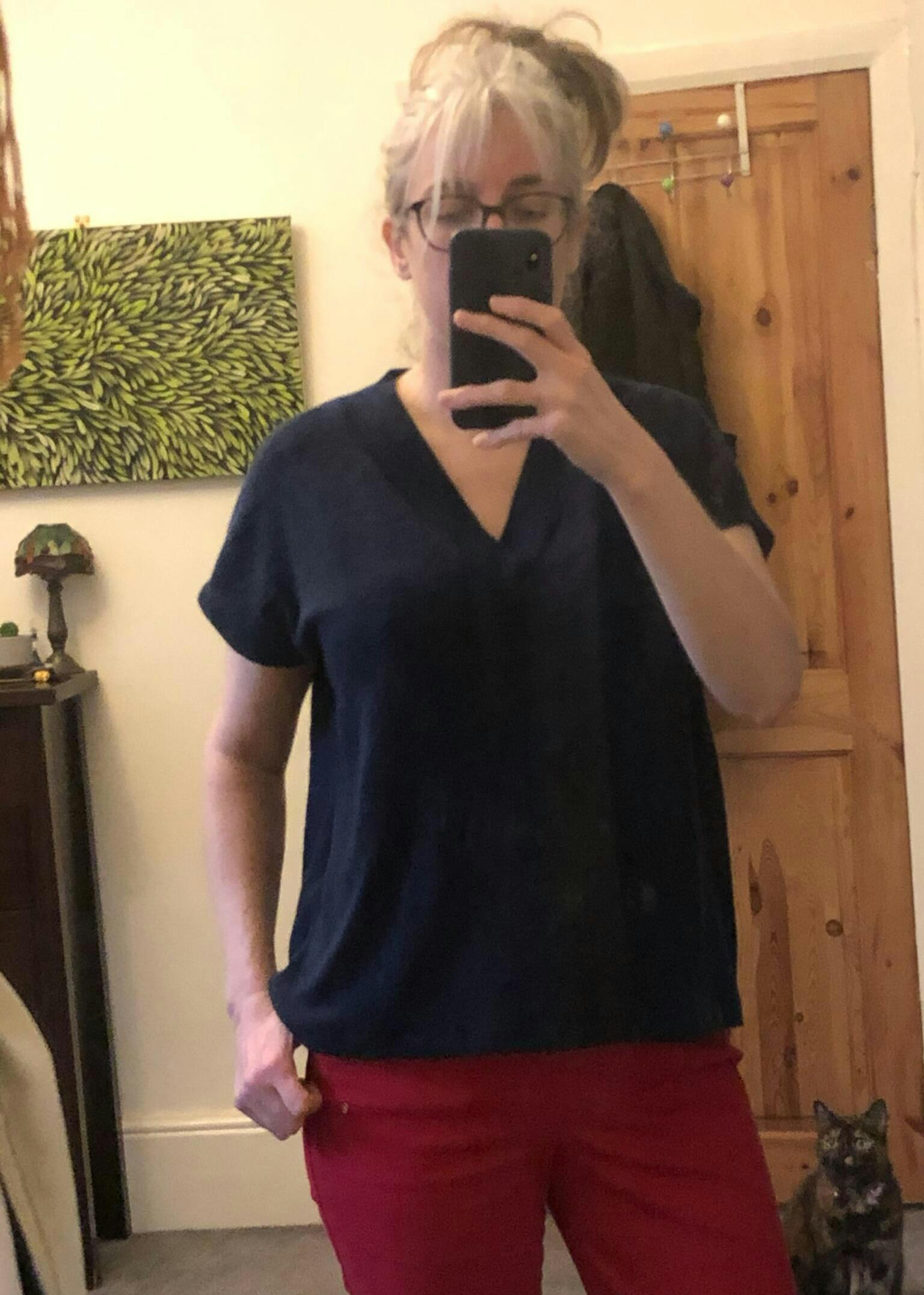 Tee Version #3 - A deep v-neck with a mitred or lapped neckband, cropped straight hem, and no sleeves.