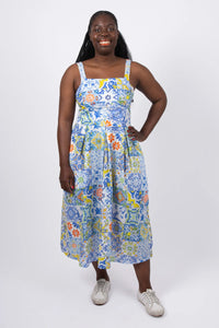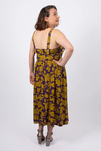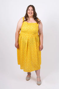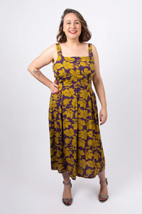 Buy the Malorie Dress sewing pattern from Sew Over It. Malorie features a midi skirt with deep pleats at the front, gathers at the back, and optional in-seam pockets. Shaping is created with unique darts in the front bodice, something a little bit different that technical sewists will love!