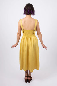 The wide, bra-covering straps are integrated into the lined front bodice to create a modern square neckline, and they are secured at the back with decorative buttons.