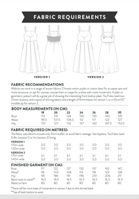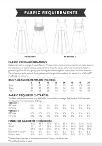 Suggested fabrics: Malorie can work in a range of woven fabrics. Choose cotton poplin or cotton lawn for an easier sew and more structure, or opt for viscose, viscose linen or crepe for a dress with more movement. A plain or geometric fabric will show off the interesting front bodice detail.