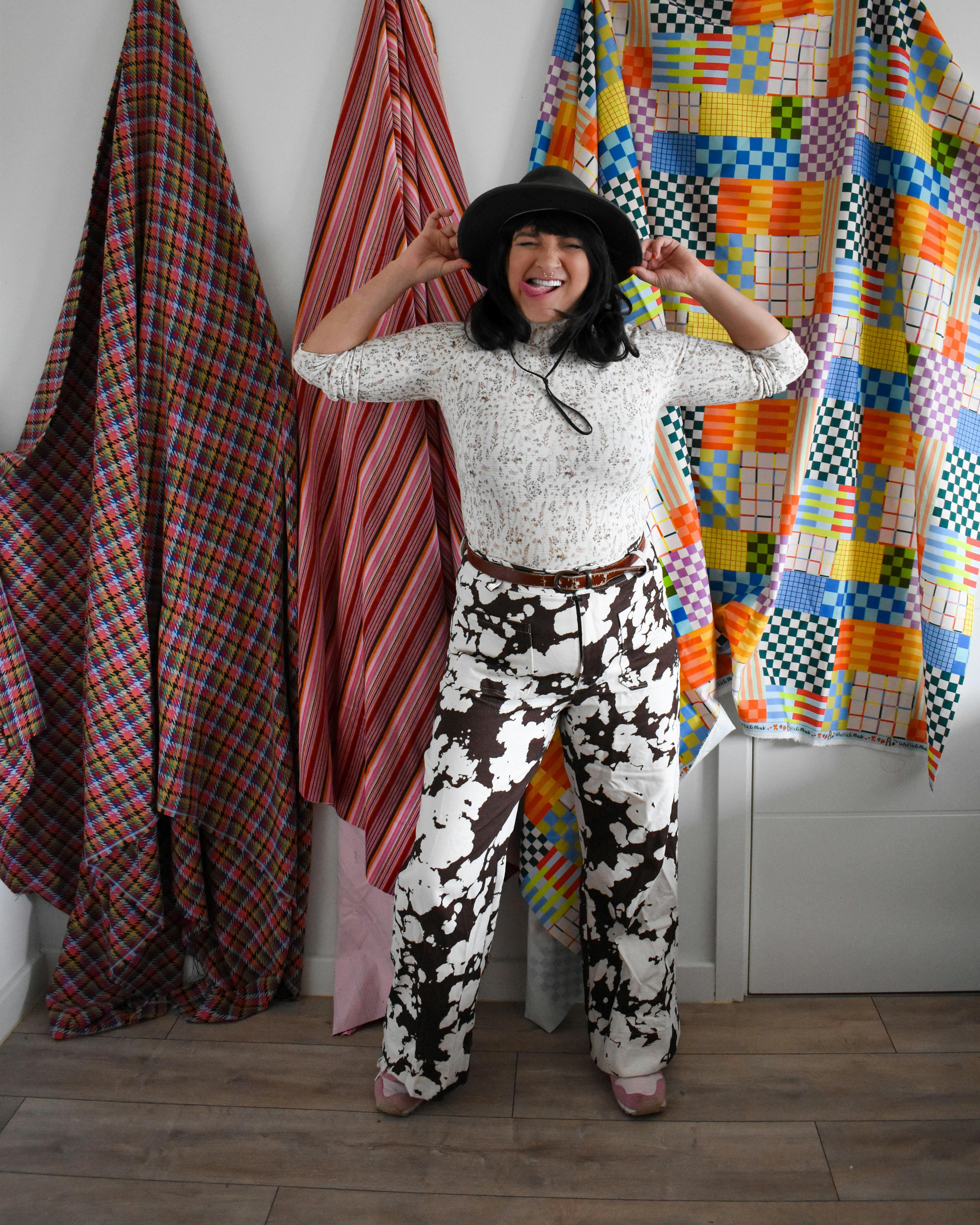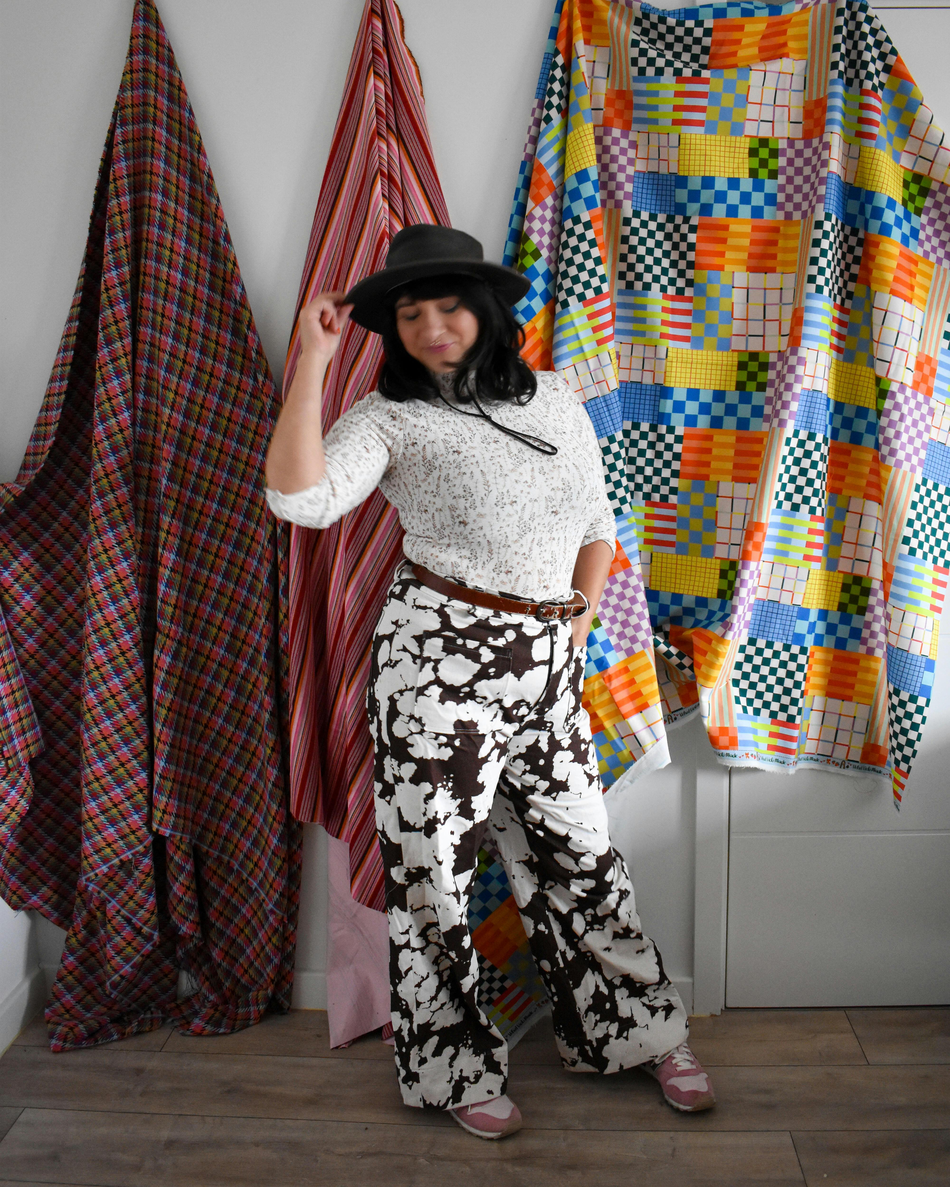 Buy the Heidi Pants sewing pattern from Sewing Patterns by Masin. The Heidi Pants are super high waist, wide leg pants or jeans. The pattern includes three length options: full length, ankle length and shorts. The front patch pockets give the pants a playful look. The back features a yoke and two more patch pockets.