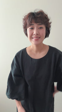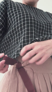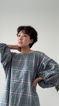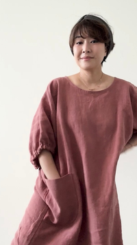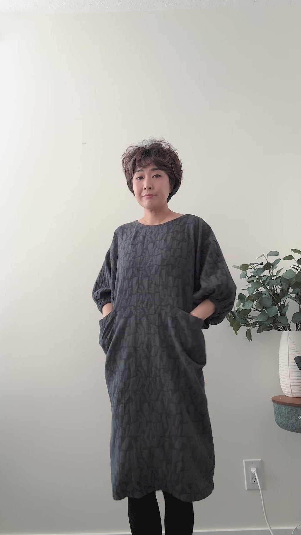 Infit's distinctive charm lies in its oversized bodice and sleeves, coupled with sleeve wings, triangular pieces that make the sewing process smoother while enhancing the overall aesthetic. The sleeves can be short, 3/4 or long and are finished with elastic. The neckline is finished with a facing, and you can add patch pockets to the dress.