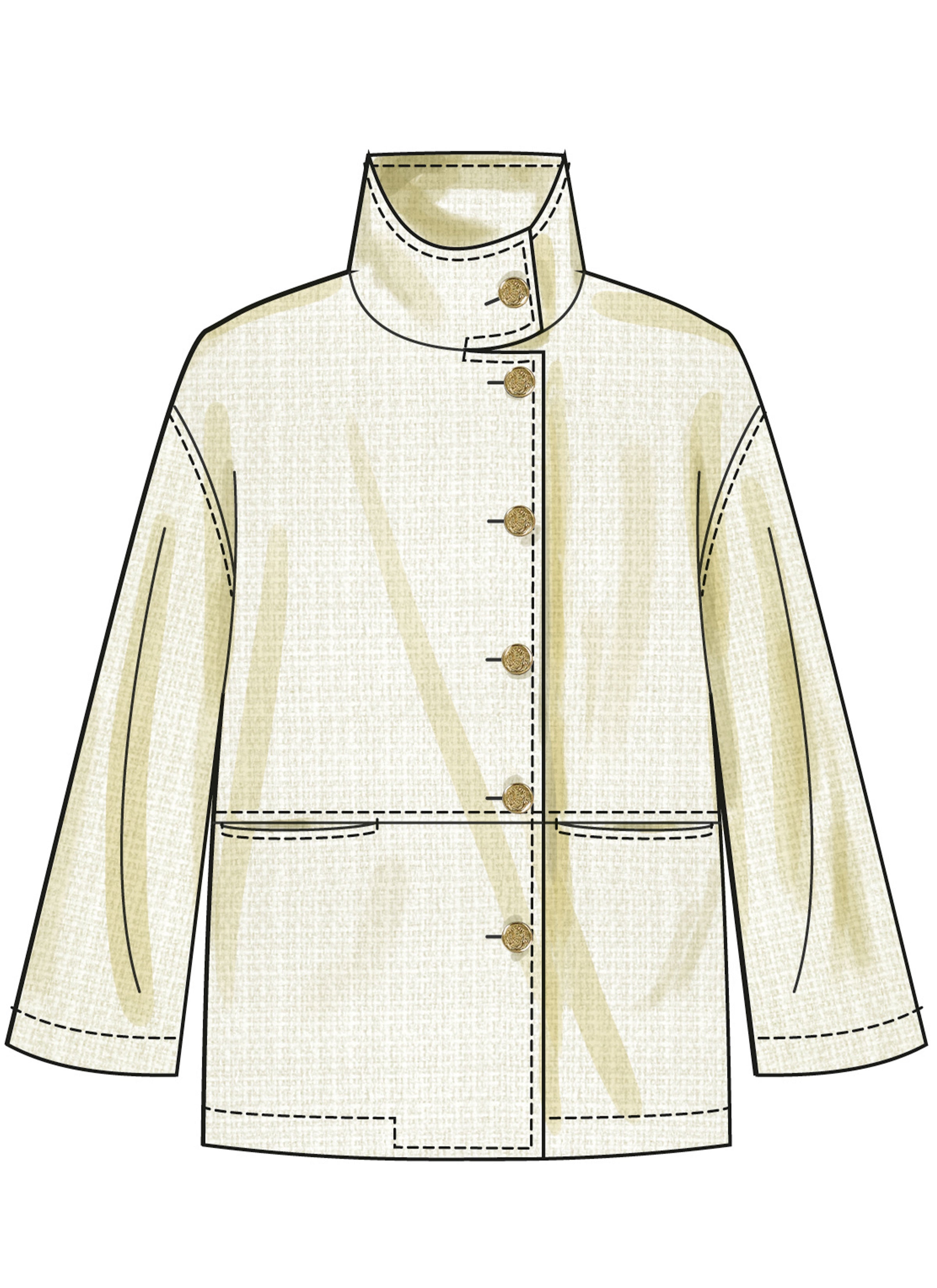 Buy the S3072 Jacket sewing pattern from Simplicity. Loose-fitting, lined jacket has high stand up collar, dropped shoulders, front in-seam pockets and topstitching. View A has self bias loop and button closure. View B has buttons and buttonholes.