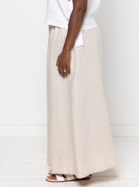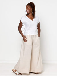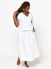 Buy the Rumi Woven Skirt and Pant sewing pattern from Style Arc. Rumi is a beginner friendly, elastic waist A-line skirt or very wide leg pant. The pant can be made in cropped or long lengths. The waistband sits on the natural waist, and both the skirt and pant have wide hem facings and optional in-seam pockets. Shown here with the Rumi Woven Top.