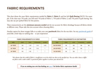 Fabric requirements: Requirements are for fabric 1, fabric 2, and low loft quilt wadding/batting EACH. Or you may use pre-quilted fabric.