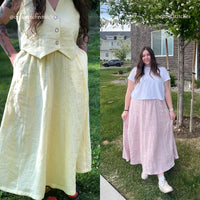 Suggested fabrics: Lightweight wovens (2-6 oz/yd²) with a moderate or fluid drape. If you are lining your skirt and/or adding godets, the designer highly recommends using fabrics weighing 4 oz/yd² or less (especially for the lining itself). Using thicker fabric can make the lining process and waistband construction quite tricky. Avoid knit fabrics or fabrics with a lot of stretch.