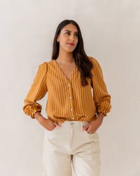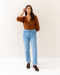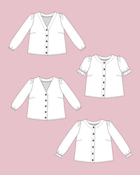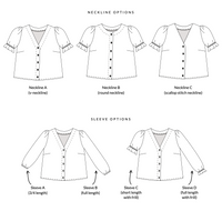 Buy the Faye Blouse sewing pattern from Tammy Handmade. The Faye Blouse is a woven top with a relaxed silhouette that feels easy to throw on. It includes three neckline options (round neck, V-neck and scalloped neck) as well as puff sleeves in three lengths to suit every season. It works perfectly tucked into a pair of jeans for a timeless piece you'll wear on repeat.
